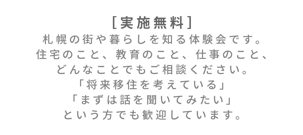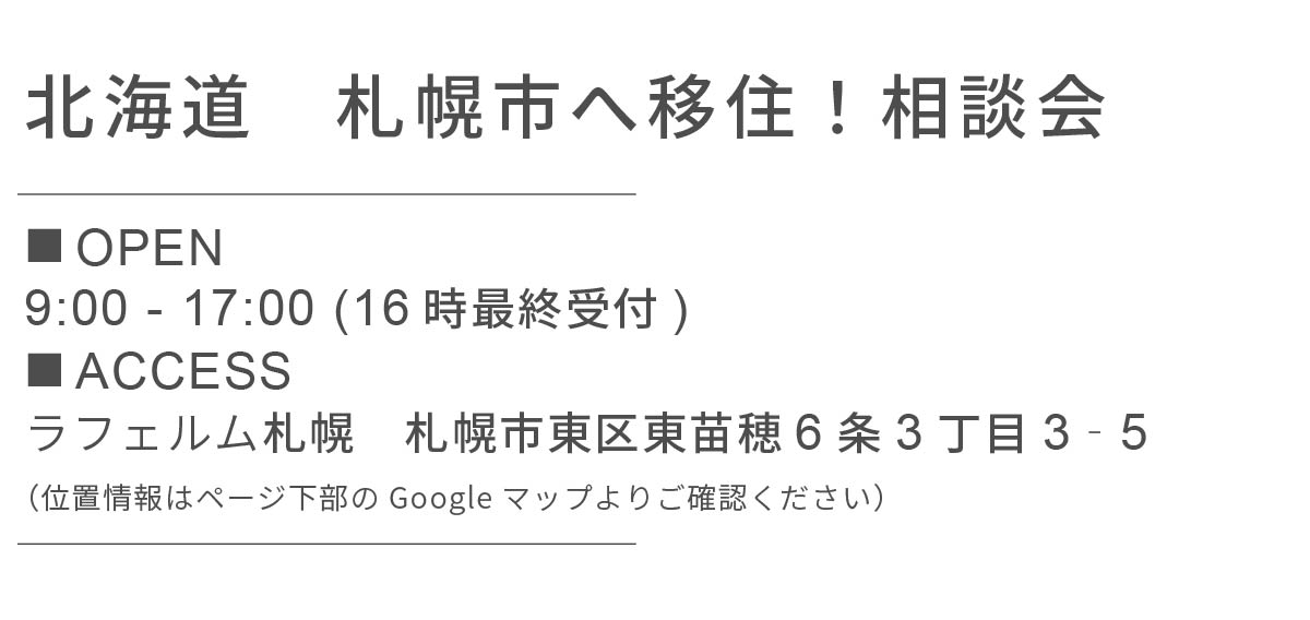 ラフェルム札幌|移住相談会|札幌に住もう 2025.07.04 「移住後の暮らし、本当にうまくいくのかな?」 そんな不安や疑問をお持ちの方も、札幌在住スタッフが丁寧にご案内いたします。 相談無料 オンラインでの個別相談も承っております。 📞 ご予約・お問合せはこちら 相談会日時 2025年10月18日(土)~10月26日(日) ※水曜除く 10:00-17:00 ラフェルム札幌(札幌市東区東苗穂6条3丁目3-5) 初回来場特典 はじめてご来場いただいた方には、 QUOカード3000円をプレゼントしております。 ※お渡しは2回目のご商談の際となりますので、 予めご了承ください。 移住相談会|札幌に住もう参加お申し込みフォーム Japan 第1希望 選択してください 第2希望 選択してください 個人情報保護方針に同意します 電話で確認する Δ 【OB様向け】ご紹介制度が新しくなりました!身近にお家づくり... ラフェルムリノベーション相談会|リノベで叶える、アンティーク... その他のイベント情報 一覧を見る 2025.05.14 【OB様向け】ご紹介制度が新しくなりました!身近にお家づくりを検討されている方がおりましたら、ぜひご紹介ください! 2025.06.09 ラフェルムリノベーション相談会|リノベで叶える、アンティークな温もりのある暮らし。 2025.06.28 贅沢なひとときを毎日に|11/15(土)-24(月祝)※水曜除く|ラフェルム家づくり相談会 2025.07.04 ラフェルム札幌|移住相談会|札幌に住もう